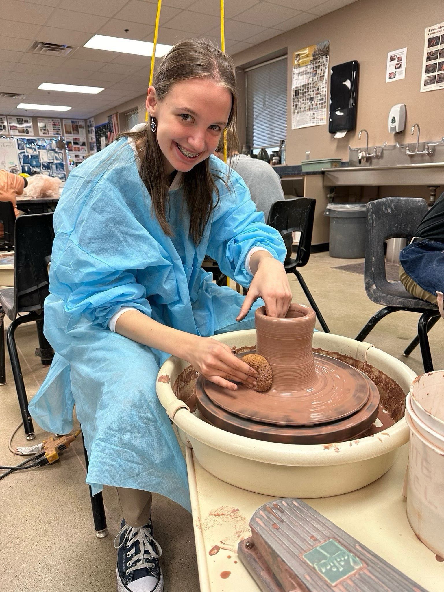 Ich hatte heute die Chance, bei einer der pottery classes mitmachen zu können. Jeder konnte am Anfang des Unterrichts direkt an seinem Projekt weiterarbeiten. Die Schüler*innen lernen in dem Unterricht den Umgang mit der Töpferscheibe und Formen aber auch mit bloßen Händen. Auch ich konnte direkt loslegen. Die fertigen Gefäße und Plastiken können im Anschluss (nach dem Brennen) mit nach Hause genommen werden. (Mona)